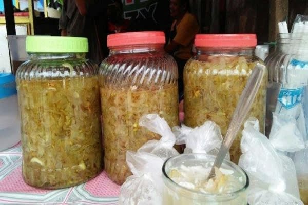 Sebelum disajikan, buah pala di iris-iris tipis. Untuk menghilangkan getahnya, Pak Ujang punya cara khusus. Setelah irisan daging buah pala sudah siap, kemudian direndam dengan air gula selama dua jam. Ini yang membuat manisnya gula menyatu dengan irisan buah pala.