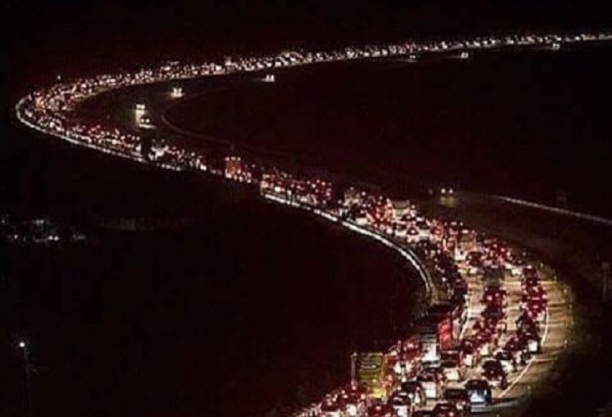 Kendaraan pun merangkak perlahan. Bahkan beberapa kali terpaksa harus berhenti, karena arus kendaraan sama sekali tak bergerak. Setelah berjam-jam merayap, akhirnya tiba di ruas jalan dekat pintu tol Cikunir, Bekasi.