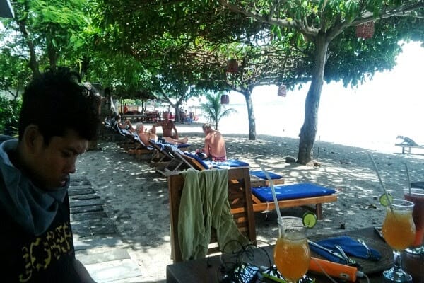 Kami pun langsung menuju saung. Kafe tak terlalu ramai. Mungkin karena masih siang. Setelah duduk di kursi, mata langsung melirik ke samping saung. Di samping saung, turis-turis bule sedang asyik santai tiduran di kursi-kursi yang dipajang berderet.
