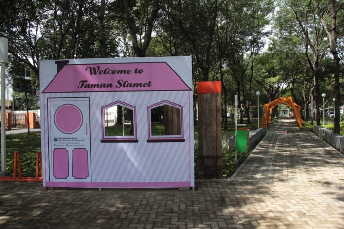 Di belakang papan nama TAMAN SLAMET ada sebuah _stand photobooth_yang berbentuk sebuah rumah dengan sebuah pintu dan dua buah jendela yang terbuka terbuka. Rumah-rumahan ini berwarna merah muda dan putih serta ada tulisan ‘Welcome to Taman Slamet” dibagian ‘atapnya’.